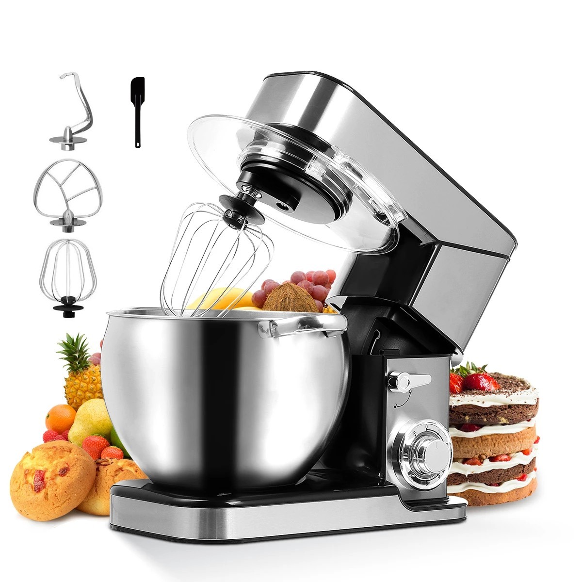 Med i pakken følger det en visp, en deigkrok og en flat blandevisp. Vispen pisker skikkelig krem fra fløten og egner seg også godt til pisking av egg. Når du skal elte deig, til for eksempel pizza, boller eller brød, er deigkroken det perfekte tilbehøret. Omrøringstilbehøret er svært godt egnet til mykere blandinger som potetmos, kakefyll, glasur o.l.
